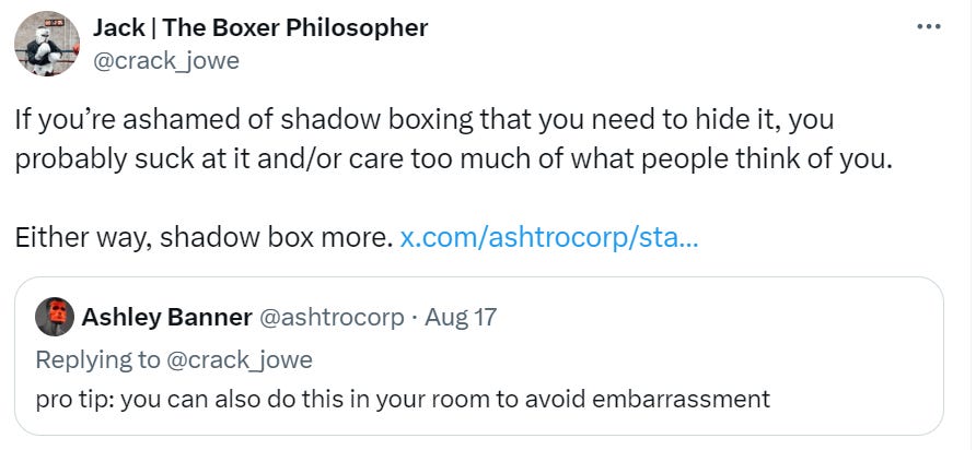 The idea of not doing something because someone you don’t know finds it ‘embarrassing’ is a damaging behavior to have. Especially in a sport with a mental toll like boxing, I felt the need to share the obvious solution to this stranger’s perceived problem: